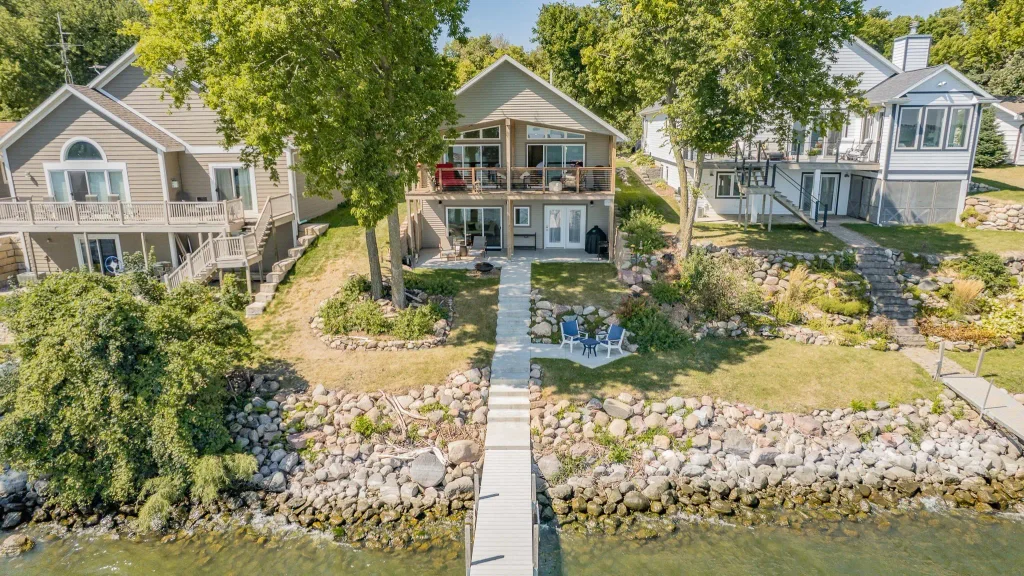 Experience modern lakeside living with this exquisite year-round home on the West shores of Big Spirit Lake, with convenient access to the bike trail and across the road from Kettleson Hogsback Reserve, with nature trails for hiking, cross country skiing and snow shoeing. Built between 2021 and 2022, this 2,246 sq ft ranch home is a haven of comfort and style. Set on 50 feet of gently sloped, beautifully landscaped lakefront, the property offers stunning views and easy access to the water. The main floor features a large entryway, and covered decks both at the entry and off the main living area. Inside, the open-concept kitchen, dining, and living area is highlighted by vaulted ceilings, a gas fireplace, Hickory cabinets interior doors and trim, that impart a warm, rustic charm. The master bedroom and bathroom are conveniently located on the main floor, separate from the other bedrooms, while the main floor also includes laundry, a walk-in pantry, and a ½ bath. The fully finished walkout basement extends your living space, with 9' ceilings, three additional bedrooms, a full bathroom, and a family room complete with a wet bar. The basement patio door opens directly to the lakefront concrete patio, perfect for relaxing or entertaining. Storage is ample with a large 26x26 detached garage featuring 10' walls with an 8'x18' garage door. This newer build offers a perfect blend of luxury and lakeside leisure—don’t miss the opportunity to make it yours. Newer Dock (12 - 8' sections) included in the sale. Some furnishings, Boat & Hoist available outside of listing