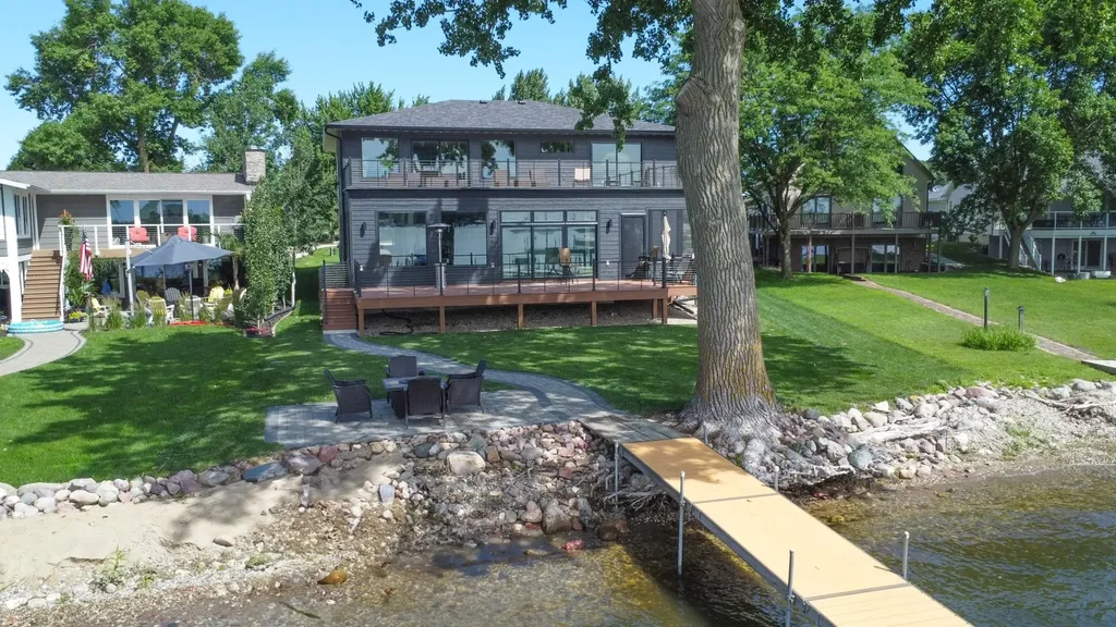 Step into streamlined luxury, where walls of glass and voluminous decks celebrate the ever-present blue hues of East Lake Okoboji. This predominantly new build with over 6,400 sq. ft. elevates lakeside living with seamless outdoor extensions – two expansive entertaining decks, a screened porch with fireplace, and a stepless approach to your lakefront dock on one of the largest square area lots in coveted Loch Knolls. Design-forward comforts continue indoors with soaring ceilings, a custom kitchen, multiple fireplaces, and a trio of living wings, each complete with its own laundry, together offering 8 bedrooms and 9 bathrooms. One of these wings functions as independent living quarters with its own entrance, lock-off capability and full kitchen. An uncommonly large driveway ensures even parking is effortless. Let your worries drift away in this stunning property!