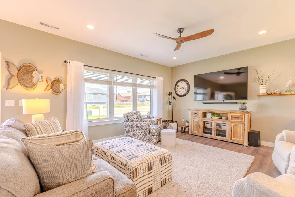 Welcome Home! This new construction 3 bed, 2 bath ranch offers 1,800 sq ft of comfortable living space designed for everyday life and easy entertaining. Upon entry, you’ll be welcomed by an open floorplan that brings the living, kitchen, and dining areas together. The spacious kitchen features an oversized island with quartz countertops, tile backsplash, under cabinet lighting, and a large pantry providing plenty of storage. Just off the dining area, step out to your covered patio and enjoy peaceful country views to the south. Heated floors throughout the property add extra comfort, and the 3 stall garage gives you ample space for vehicles and storage. The primary suite includes a private bath with dual vanities, a tile shower, and a walk-in closet. Two additional guest rooms offer flexibility for a home office, gym, or additional bedrooms. A full bath and laundry room with extra storage complete the layout. Located in Spirit Lake’s Southern Hills Addition, you’ll be just minutes from downtown shops, restaurants, parks, the YMCA, and the local trail system. If you’re looking for a new home in a great location, this one truly checks all the boxes. Schedule your private showing today!